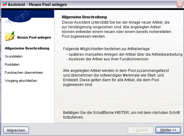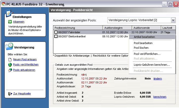 Bearbeiten Sie die einzelnen Schritte des Assistenten und wechseln Sie mithilfe der Schaltfläche [Weiter] zum nächsten Punkt. Beim Abschluss wird der neue Pool angelegt und Ihnen in der Übersicht der vorbereiteten Versteigerungspools zur weiteren Bearbeitung angezeigt. Die weitere Bearbeitung erfolgt durch [Doppelklick] oder mithilfe von [Rechtsklick - Artikel bearbeiten] auf den neu angelegten Pool.