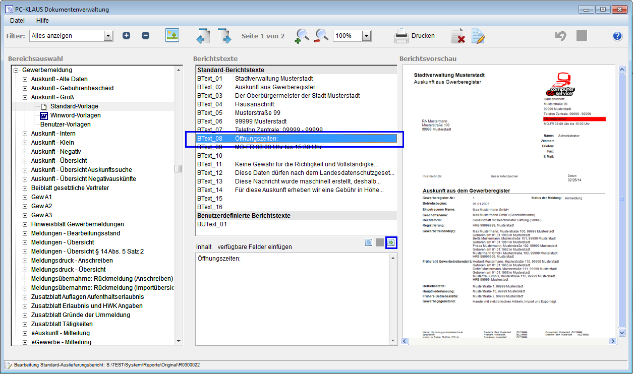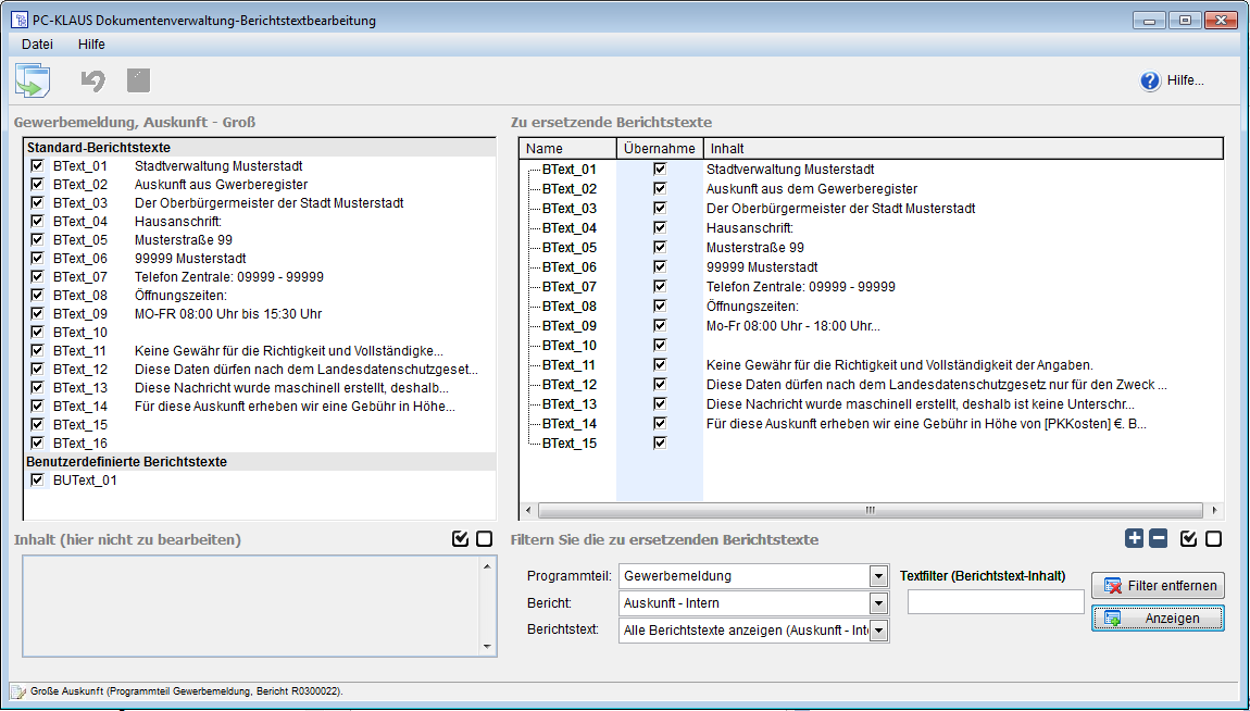 Geben Sie die Berichtstexte für einen Bericht ein und prüfen Sie in der Vorschau, ob die Eingaben Ihren Erwartungen entsprechen. Wir empfehlen die Große Auskunft zu nutzen, da dort alle Berichtstextfelder enthalten sind.