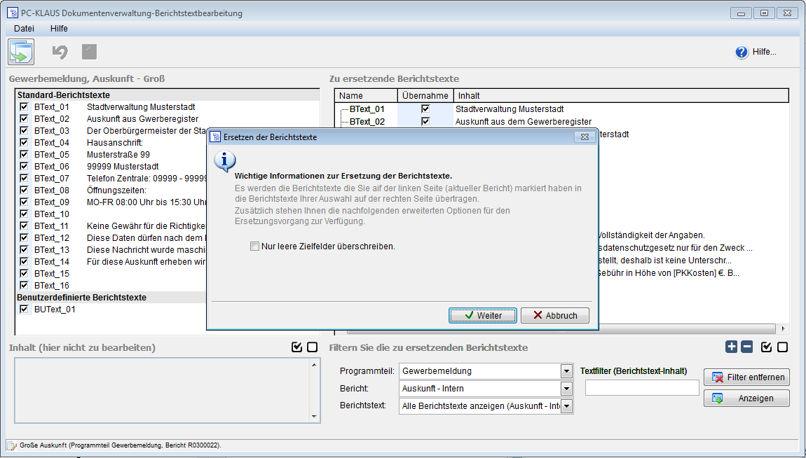 Als letzte Auswahl haben Sie noch die Möglichkeit die Zusatzoption "nur leere Berichtstexte überschreiben" zu wählen. Nach dem Betätigen der Schaltfläche [Weiter] erden Ihre Ersetzungen vorgenommen.