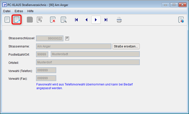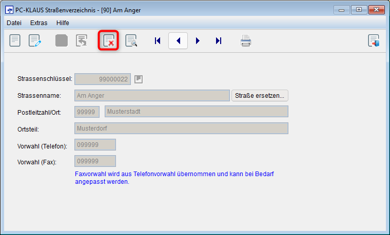 Um eine bestehende Straße in PC-KLAUS zu löschen, rufen Sie sich über die Suchfunktion (weiter oben beschrieben) die zu löschende Straße raus.