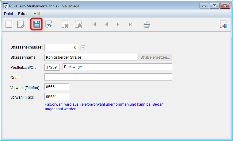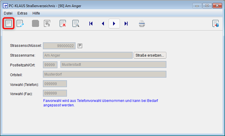 Um dem Straßenverzeichnis von PC-KLAUS eine neue Straße hinzuzufügen, klicken Sie auf die leere Schaltfläche "Neuanlage".