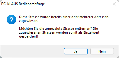 Wenn Sie versuchen eine Straße zu löschen, die bereits in einer Personen- oder Betriebsstättenanschrift verwendet wird, erhalten Sie folgende Bedienerabfrage: