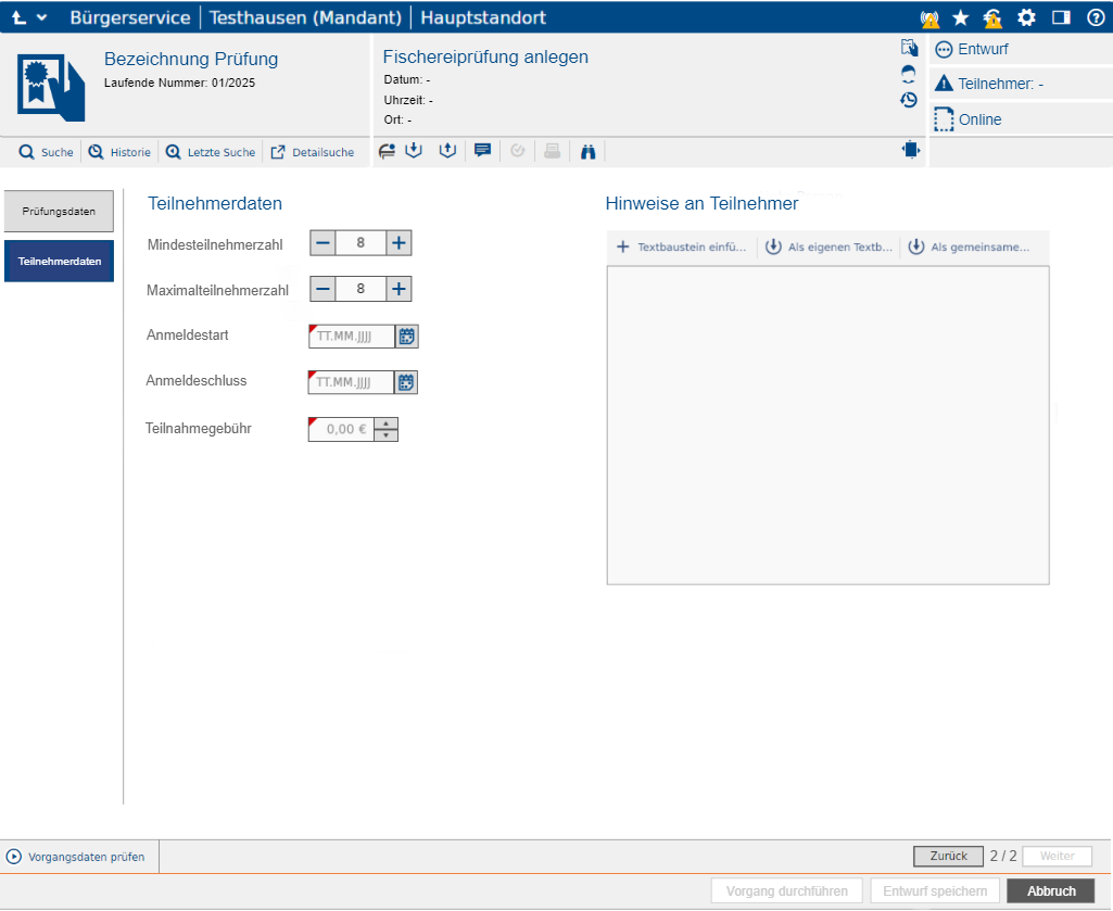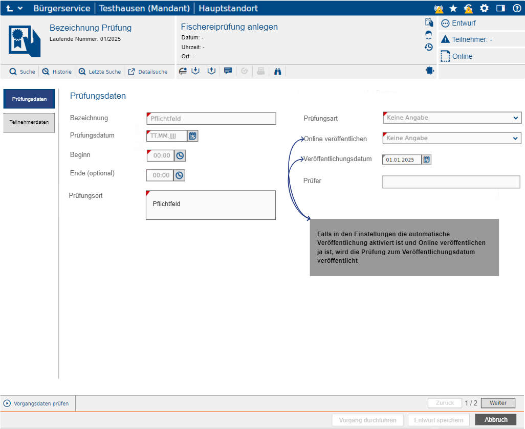 Dieser Vorgang dient der Erfassung einer neuen Prüfung. Dabei werden alle relevanten Daten zur Prüfung erfasst und gespeichert. Die Prüfung wird anschließend veröffentlicht und für die Online-Bürgeranmeldung freigegeben.