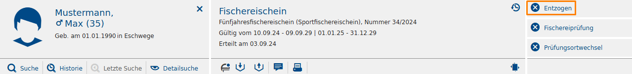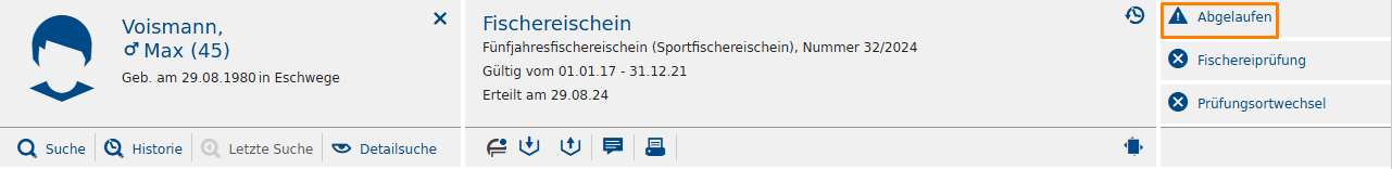 Die Statusinformationen zeigen schnell, ob der Fischereischein der Person erteilt, entzogen oder abgelaufen ist.