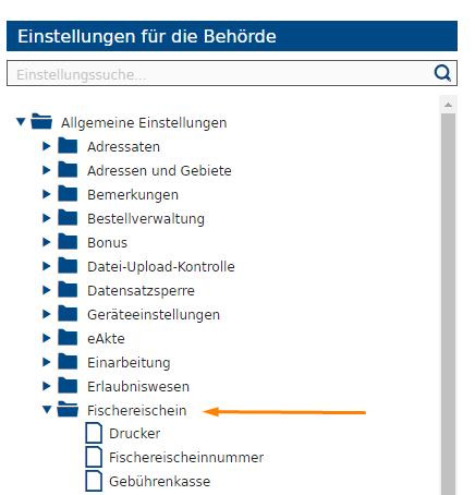 Starten Sie das Modul "Einstellungen" und wählen Sie im Navigationsbaum "Fischereischein" aus.