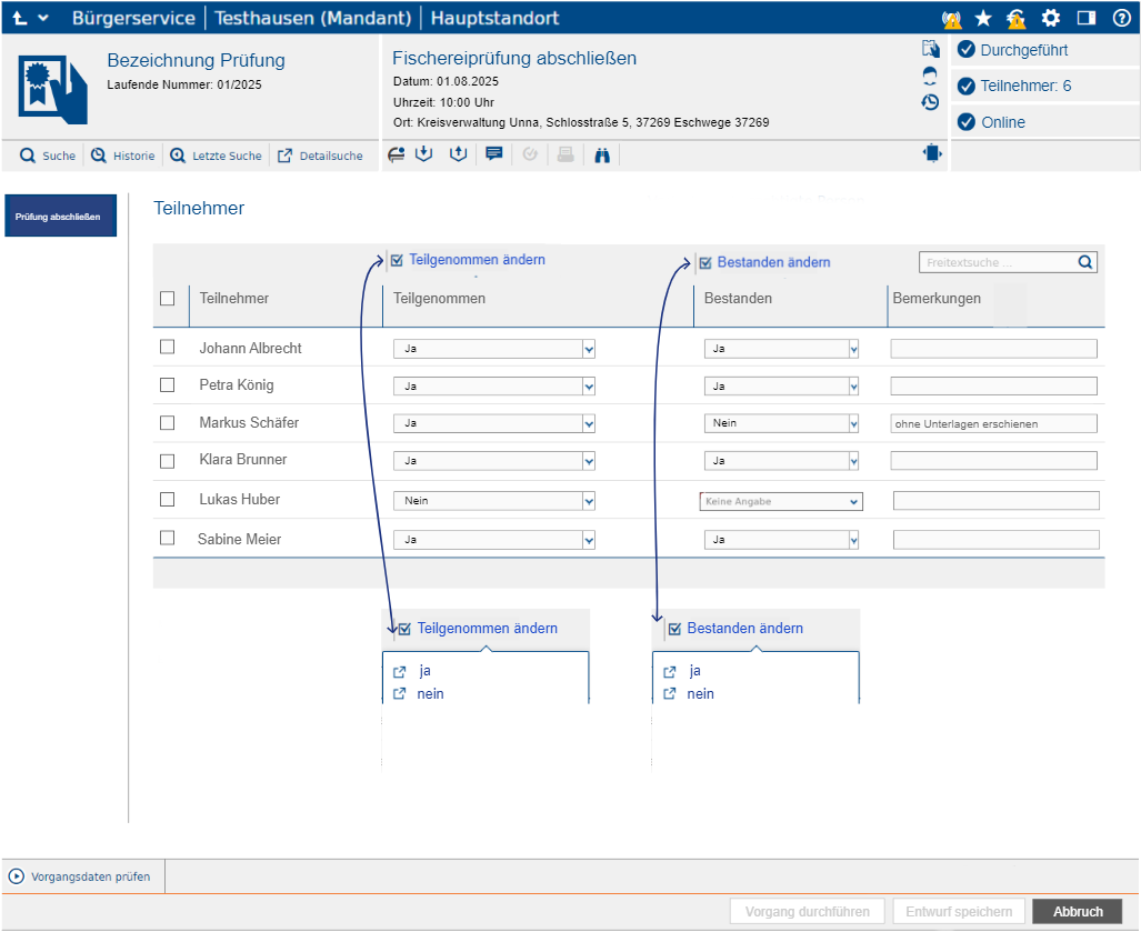 Bei diesem Vorgang können Sie angeben, welche Teilnehmer tatsächlich an der Veranstaltung teilgenommen haben und wer die Prüfung bestanden und nicht bestanden hat. Dieser Vorgang schließt die Prüfung formal ab.