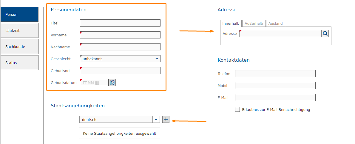 Tragen Sie hier Vorname, Nachname, Geschlecht, Geburtsort und -datum ein. Hinterlegen Sie auch die Staatsangehörigkeit(en), indem Sie die jeweilige Staatsangehörigkeit auswählen und anschließend auf das