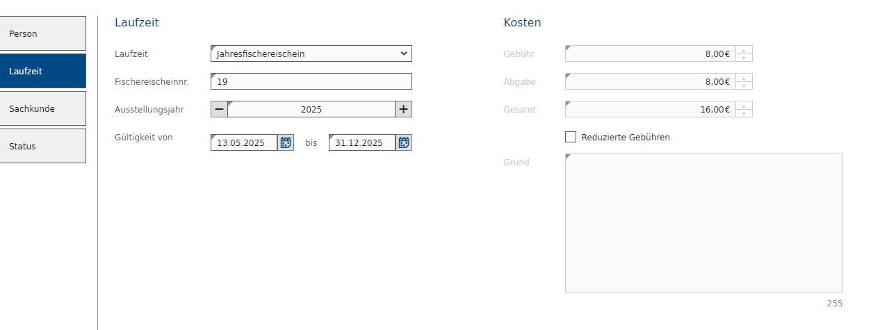 Treffen Sie Angaben zum Fischereischein. Die verfügbaren Laufzeiten des Scheins variieren nach Bundesland. Dies gilt auch für die Kosten. Wenn die Kosten aus bestimmten Gründen reduziert werden, wählen Sie "Reduzierte Gebühren" aus und geben Sie darunter im Textfeld eine Begründung an.