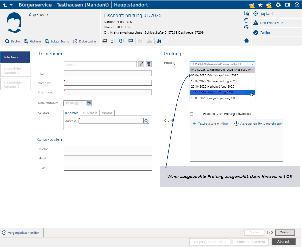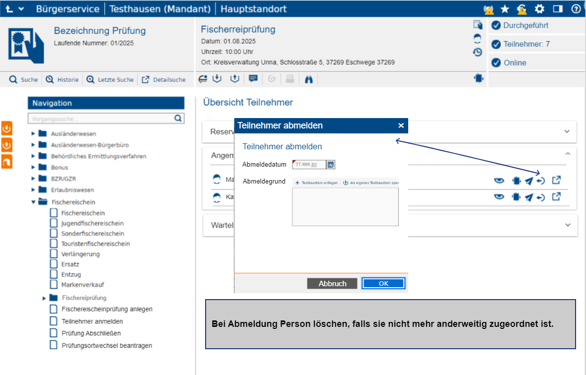 Um einen Teilnehmer anzumelden, kann dieser das über eine Online-Plattform selbst tun oder Sie erfassen Ihn, indem Sie im Navigationsbaum "Fischereischein" auswählen, dann "Fischereischeinprüfung" und dann "Fischereischeinprüfung Anmeldung".