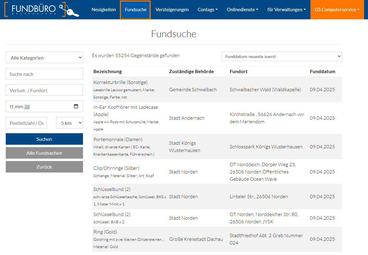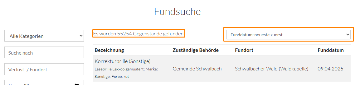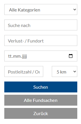 Betätigen Sie nach Konfiguration der Filter den Schalter "Suchen" um die Fundsachen zu filtern. Über "Alle Fundsachen" heben Sie Ihre Filterkriterien auf und suchen nach allen verfügbaren Fundsachen.