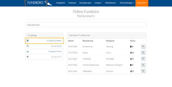 Hier können Sie eine Fundanzeige aufgeben, indem Sie auf "Fundsachen erfassen" klicken.