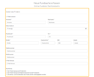 Geben Sie die Daten des Finders an, falls kein Finder bekannt ist klicken Sie "Finder anonym".