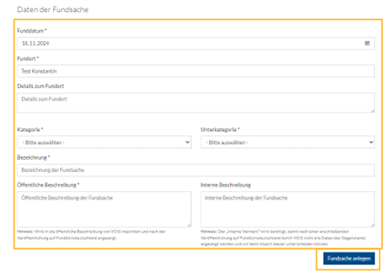 Tragen Sie nun die "Daten der Fundsache" ein und klicken auf "Fundsache anlegen".