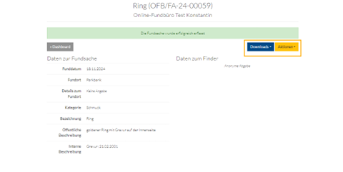 Um die Fundanzeige abzuschließen, können Sie zunächst über „Downloads“ das Fundetikett und die Fundanzeige drucken. Über „Aktionen“ können Sie die Fundanzeige abschließen, indem Sie entweder auswählen, dass der Gegenstand an den Verlierer zurückgegeben wurde, oder die Fundanzeige löschen.