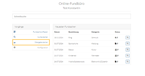 Sie wollen Ihre Fundgegenstände an Ihr Fundbüro übergeben, dann klicken Sie auf "Übergabe starten".