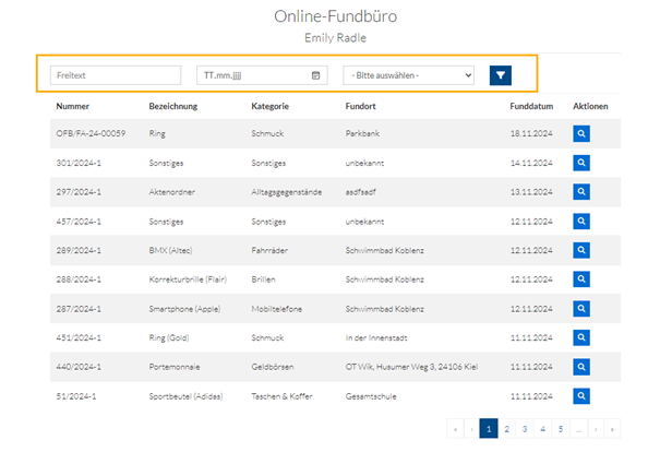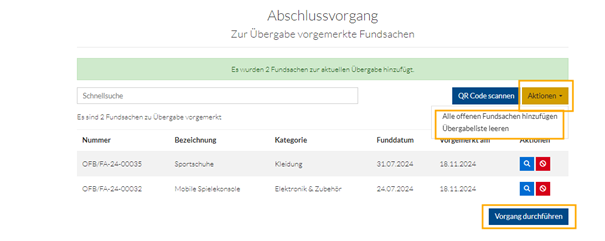 Hier können Sie über "Aktionen" alle Fundsachen hinzufügen und dann den "Vorgang durchführen" Button klicken, um die gewünschten Fundsachen zu übermitteln.