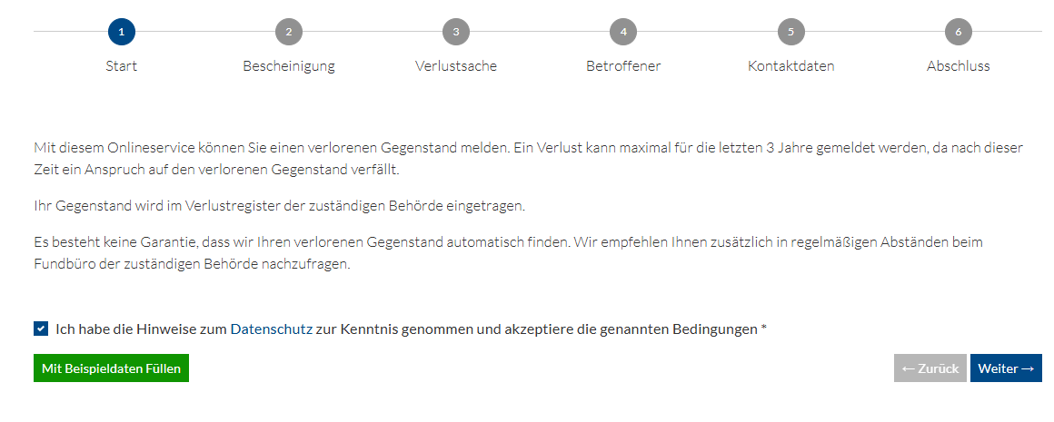 Um die Aufnahme der Verlustanzeige zu beginnen, nehmen Sie bitte die Hinweise zum Datenschutz zur Kenntnis.