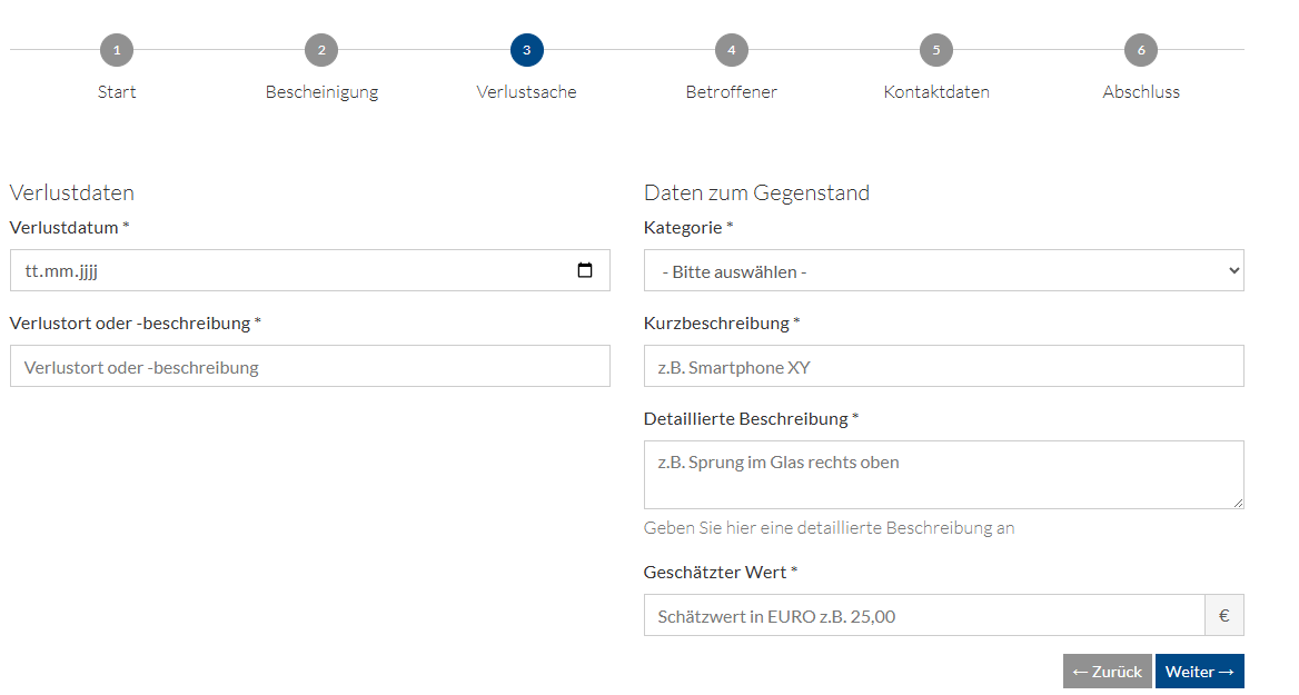Tragen Sie hier Informationen zur Verlustsache, wie beispielsweise Verlustdatum und Informationen zum Gegenstand, wie beispielsweise Kategorie oder Beschreibung ein. Geben Sie außerdem einen Schätzwert an.