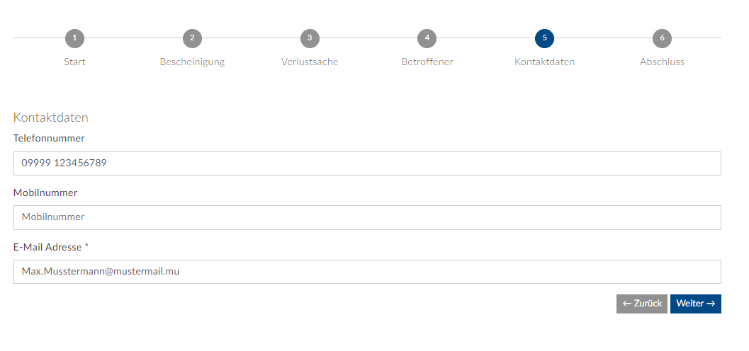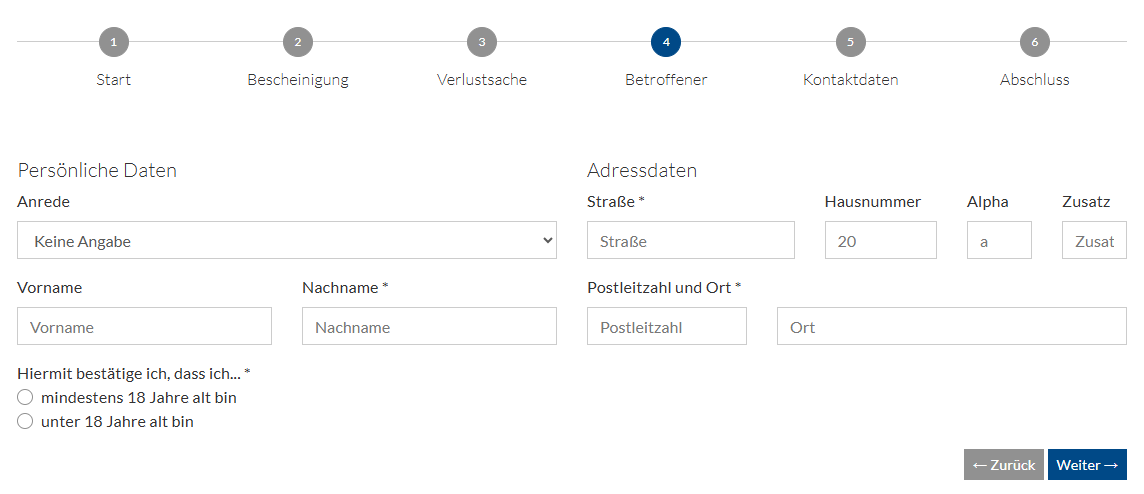 Bitte beachten Sie, dass hier die Verlustanzeige ohne Verlustbescheinigung erstellt wird. Um genauere Informationen zur Verlustbescheinigung-Online zu erhalten, beachten Sie bitte den Artikel Verlustbescheinigung-Online.