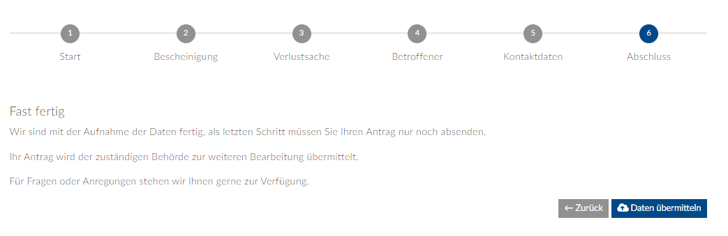 Um die Verlustanzeige abzuschließen, bestätigen Sie die Übermittlung der Daten über die Schaltfläche "Daten übermitteln".