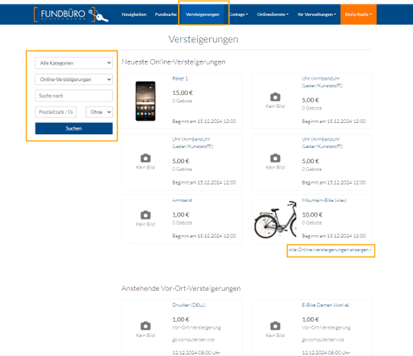 Filtern Sie nach Gegenständen, die Sie ersteigern wollen, oder klicken Sie auf „Alle Online-Versteigerungen anzeigen“.