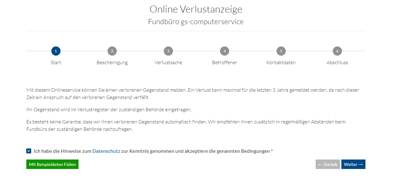 Um die Aufnahme der Fundanzeige zu beginnen, nehmen Sie bitte die Hinweise zum Datenschutz zur Kenntnis.