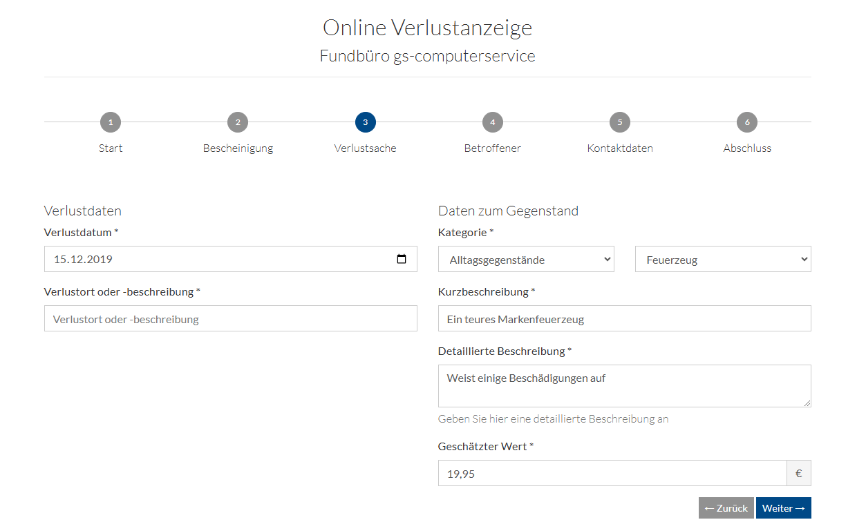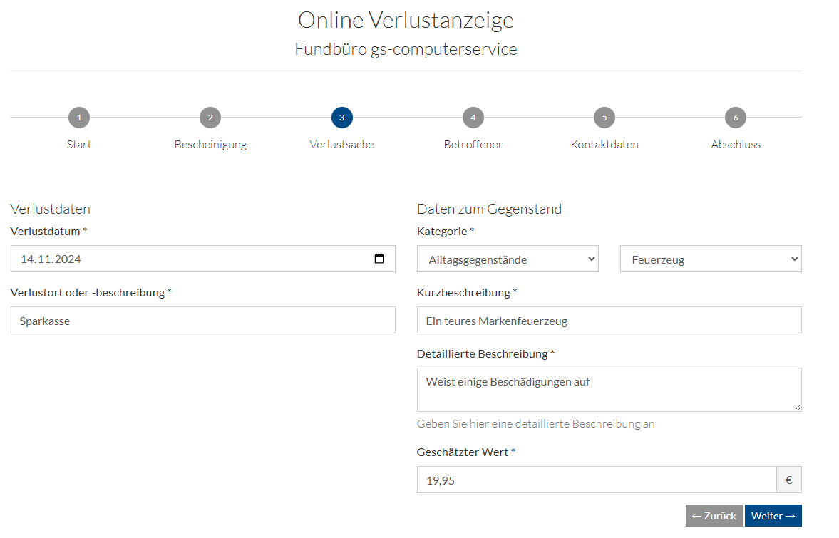Tragen Sie hier die Informationen zu Verlustsache, wie beispielsweise Verlustdatum und Informationen zum Gegenstand, wie beispielsweise Kategorie oder Beschreibung ein. Geben Sie außerdem einen Schätzwert ein an.