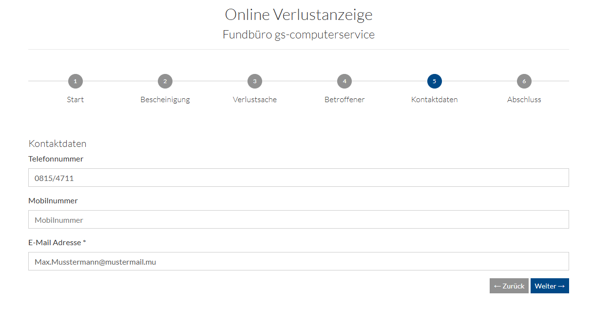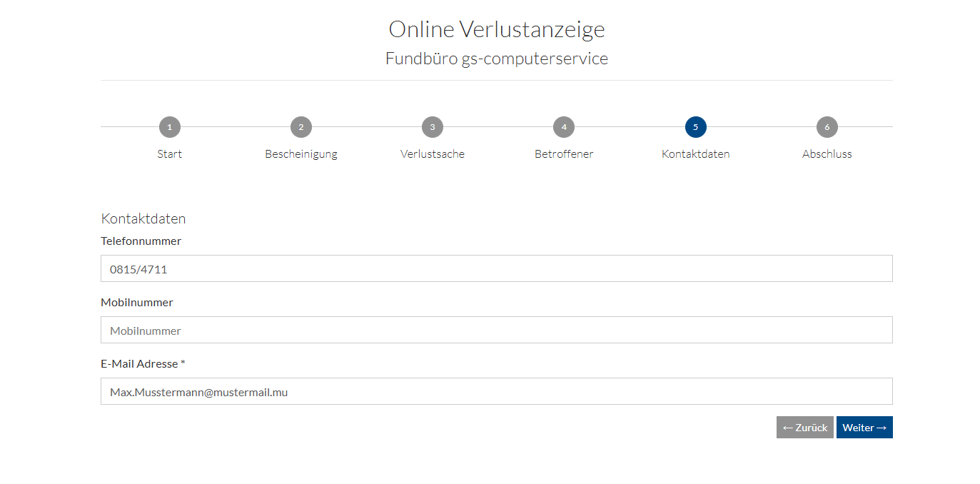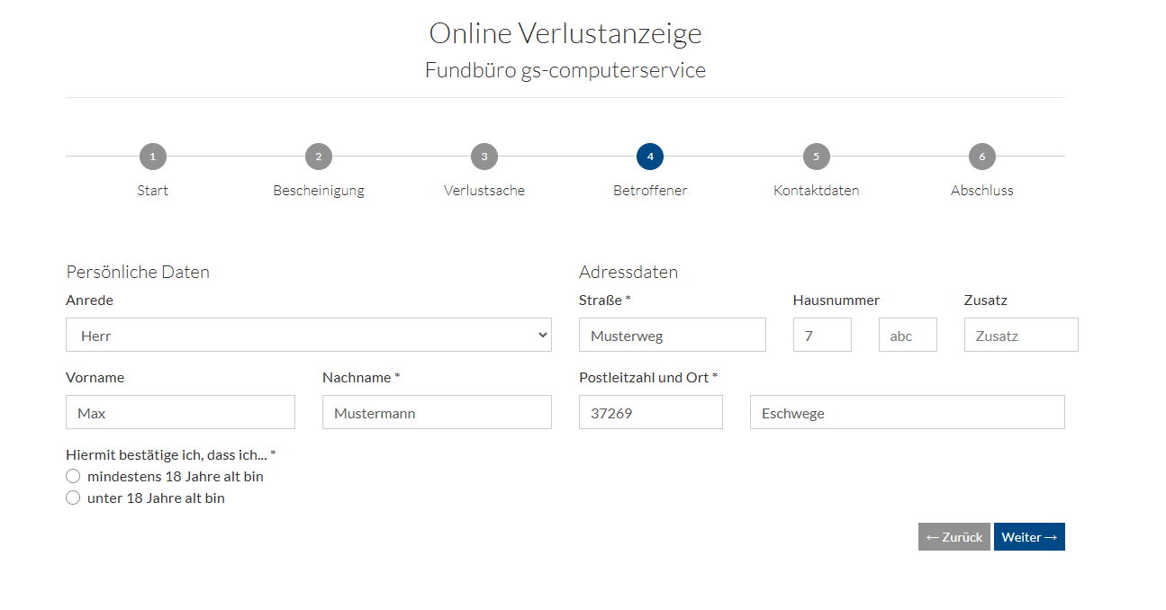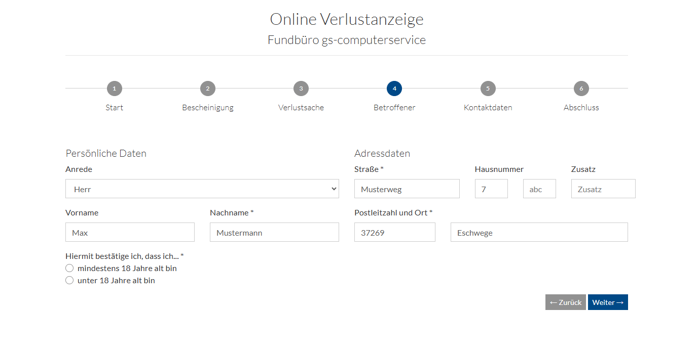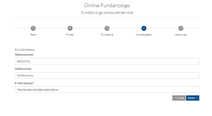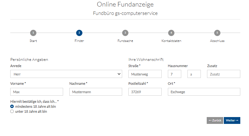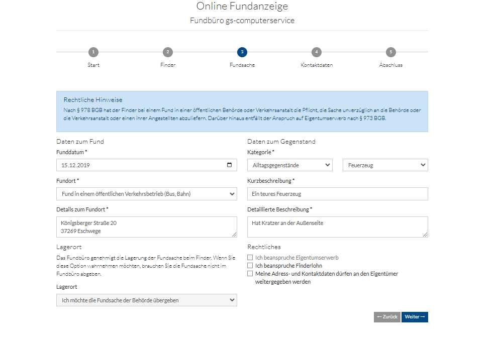 Tragen Sie hier Informationen zum Fund, wie beispielsweise Fundort oder Funddatum und Informationen zum Gegenstand, wie beispielsweise Kategorie oder Beschreibung ein. Geben Sie außerdem an, ob Finderlohn und Eigentumserwerb beansprucht werden, sowie ob Adress- und Kontaktdaten an den Eigentümer der Fundsache übermittelt werden dürfen.
