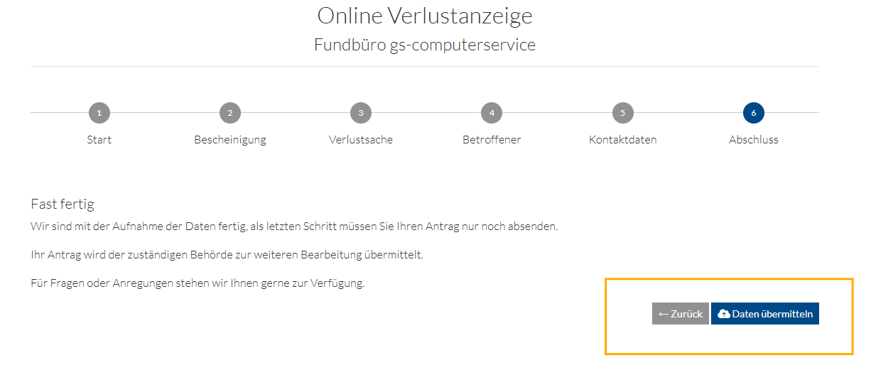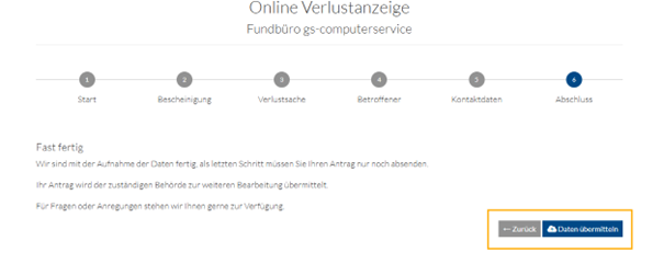 Um die Verlustanzeige abzuschließen, bestätigen Sie die Übermittlung der Daten über die Schaltfläche "Daten übermitteln".