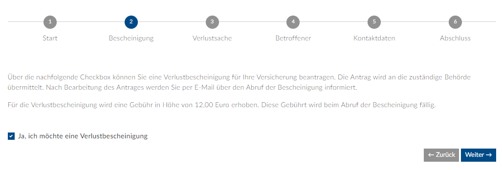 Bitte beachten Sie, dass hier die Verlustanzeige ohne Verlustbescheinigung erstellt wird. Um genauere Informationen zur Verlustbescheinigung-Online zu erhalten, beachten Sie bitte den Artikel „Verlustbescheinigung-Online“.