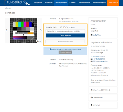 Wählen Sie ihren gewünschten Gegenstand aus und geben Sie, sobald es möglich ist Ihr Gebot ab.