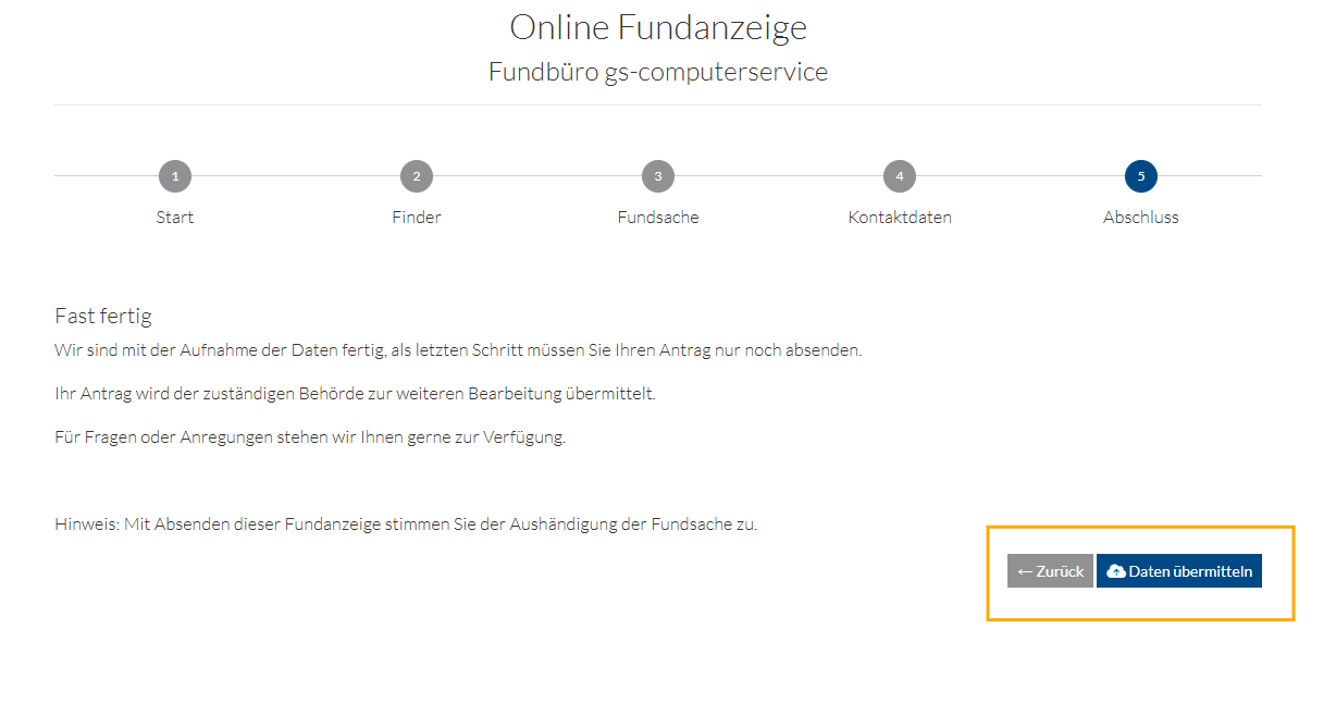 Um die Fundanzeige abzuschließen, bestätigen Sie die Übermittlung der Daten über die Schaltfläche „Daten übermitteln“.