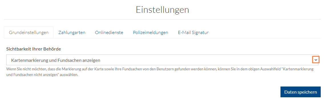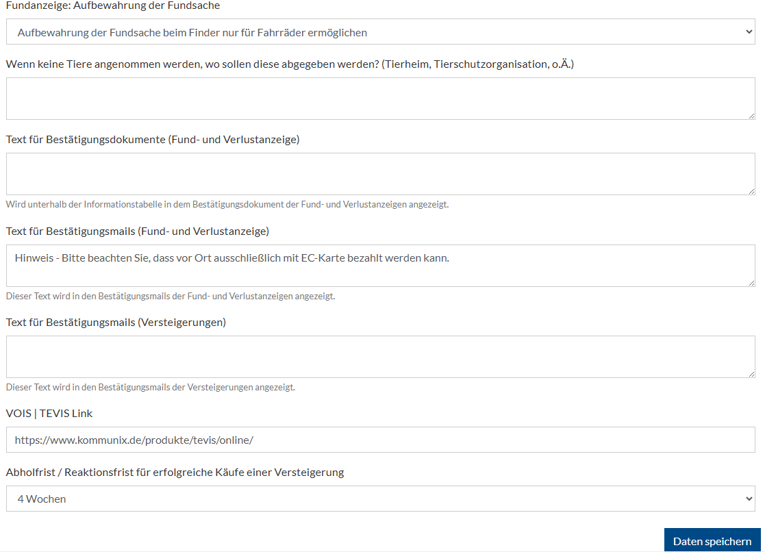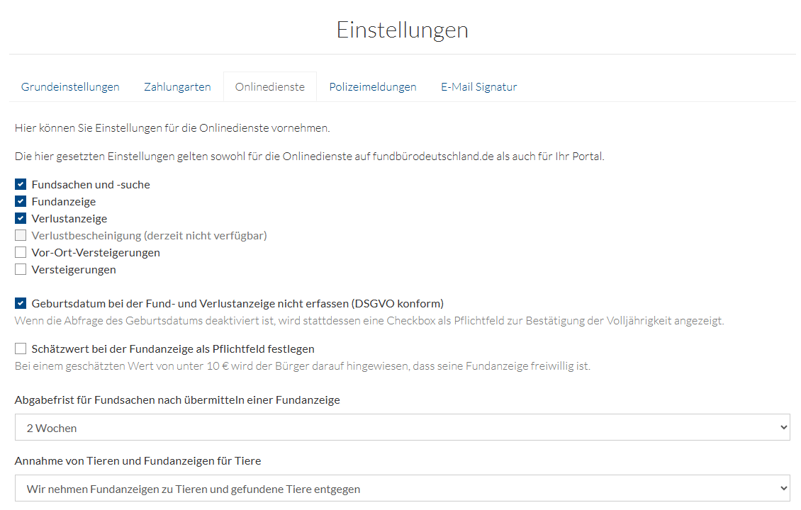 Wählen Sie aus, welche Online-Dienste Sie anbieten möchten. Legen Sie außerdem eine Abgabefrist für Fundsachen zu denen eine Fundanzeige aufgegeben wurde fest.