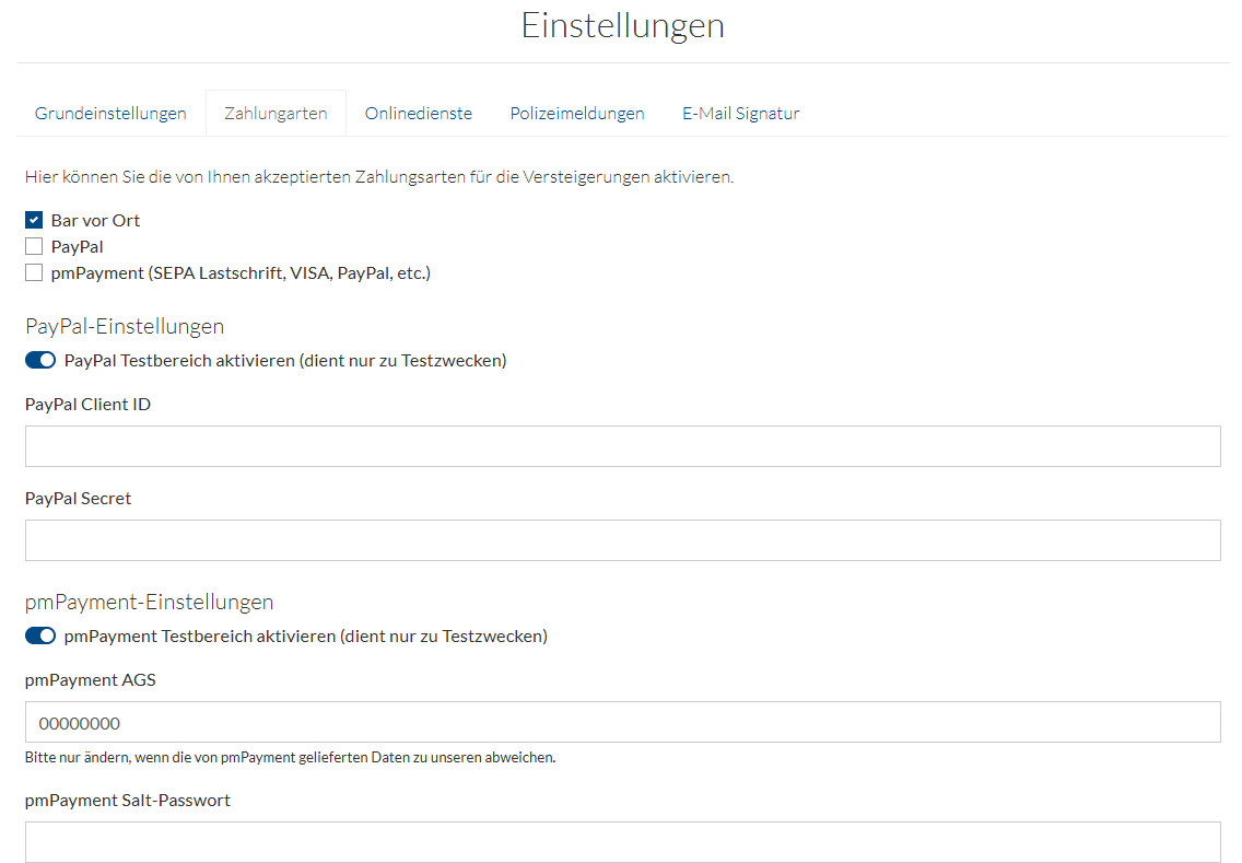 Wählen Sie aus, welche Zahlungsarten Sie für die Online-Versteigerungen zulassen wollen und geben Sie Ihre Daten an.