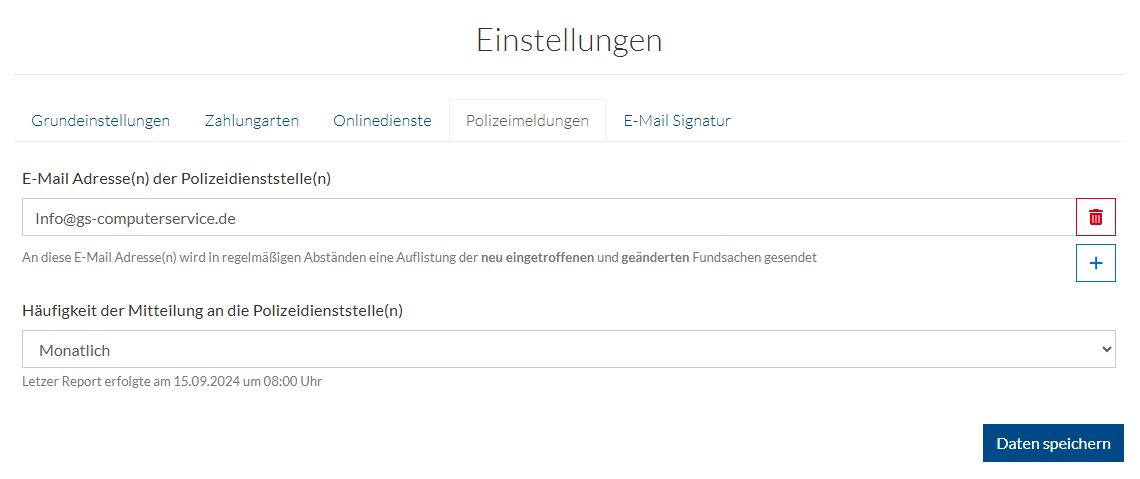 Unter "Polizeimeldungen" können Sie in regelmäßigen Abständen eine Liste über alle neu eingetroffenen Fundsachen zu einer oder mehreren Polizeidienststellen senden. Geben Sie dazu die Email-Adresse(n) an und legen Sie die Häufigkeit der Mitteilungen fest.