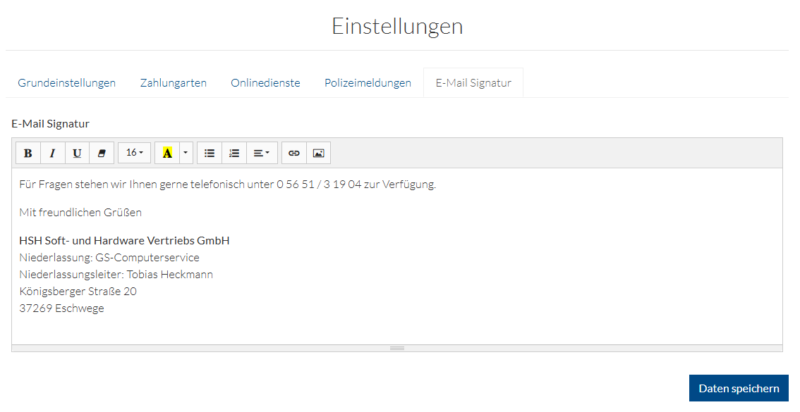Unter "E-Mail Signatur" können Sie eine Signatur für Ihre E-Mails konfigurieren. Dies könnte beispielsweise folgendermaßen Aussehen: