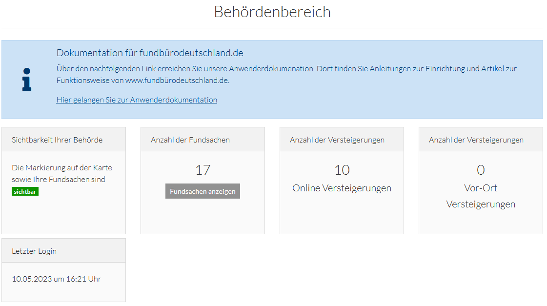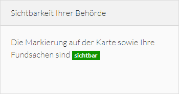 Die Kachel „Sichtbarkeit Ihrer Behörde“ zeigt Ihnen die aktuelle Einstellungen in Bezug auf Markierungen und Veröffentlichung der von Ihnen verwalteten Fundsachen.