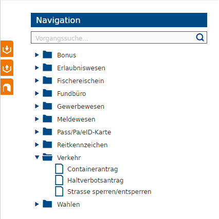 Der Navigationsbaum ist der Bereich, in welchem all Ihre VOIS-Anwendungen und Vorgänge zur Verfügung stehen. Zum Beispiel steht die Anwendung Verkehr mit Vorgängen für Container- und Halteverbotsanträge, sowie Straße sperren/entsperren bereit.