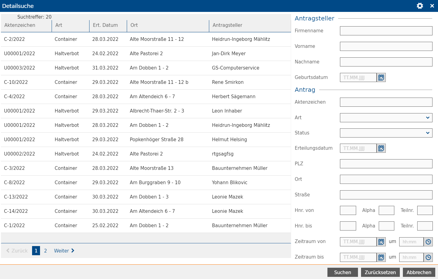 Um genauer nach einem Antrag zu suchen, nutzen Sie die Detailsuche. In der rechten Spalte können Sie Ihre Suche mit Filterkriterien eingrenzen. Klicken Sie auf einen Eintrag in der Liste, um diesen zur weiteren Bearbeitung zu übernehmen (siehe Bezugsobjekte).