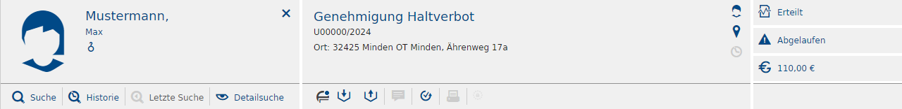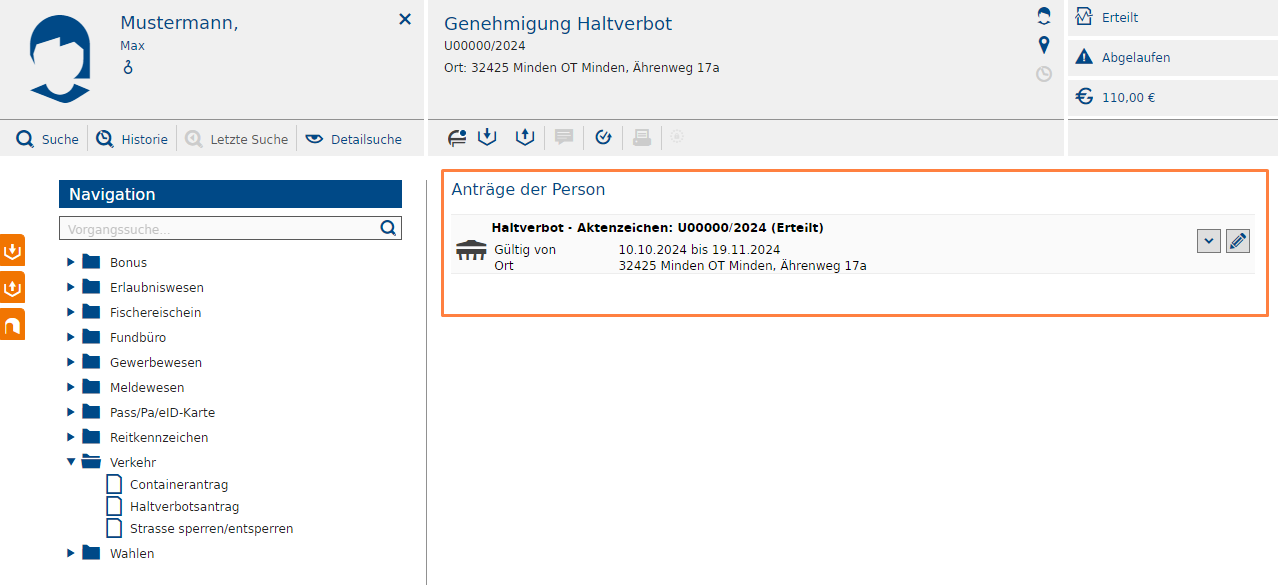 Der Objektbereich zeigt Informationen zur ausgewählten Person. Die Infoarea enthält Details zum neusten Antrag der Person. Die Statusinformationen zeigen Informationen zu den Gebühren des Antrags, ob dieser aktiv ist und ob er erteilt wurde.