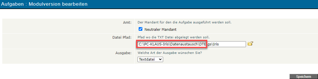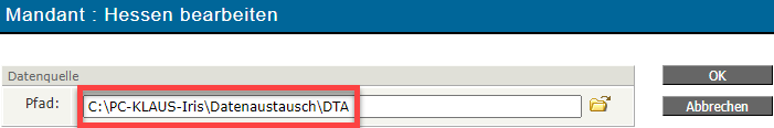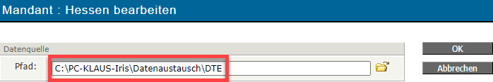 Somit lautet ein Beispielpfad C:\IRIS\Datenaustausch\DTE und C:\IRIS\Datenaustausch\DTA