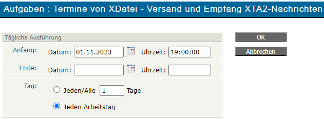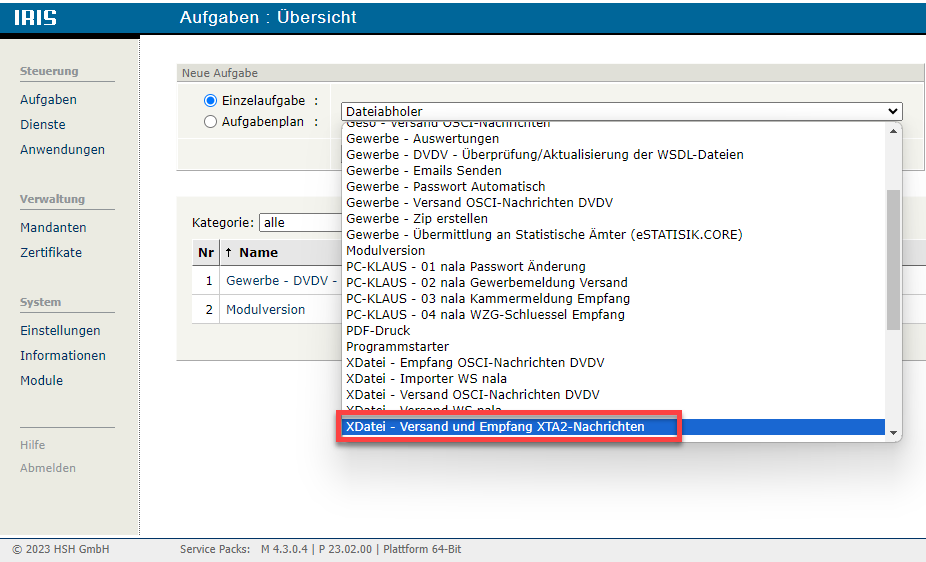Hier wählen Sie aus dem Drop-Down-Menü die Einzelaufgabe "XDatei - Versand und Empfang XTA2-Nachrichten" aus und betätigen die Schaltfläche [Weiter].