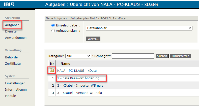Dazu navigieren Sie - nach der Anmeldung des Superusers am PC-KLAUS-IRIS Dienst - auf den Menüpunkt [Aufgaben].