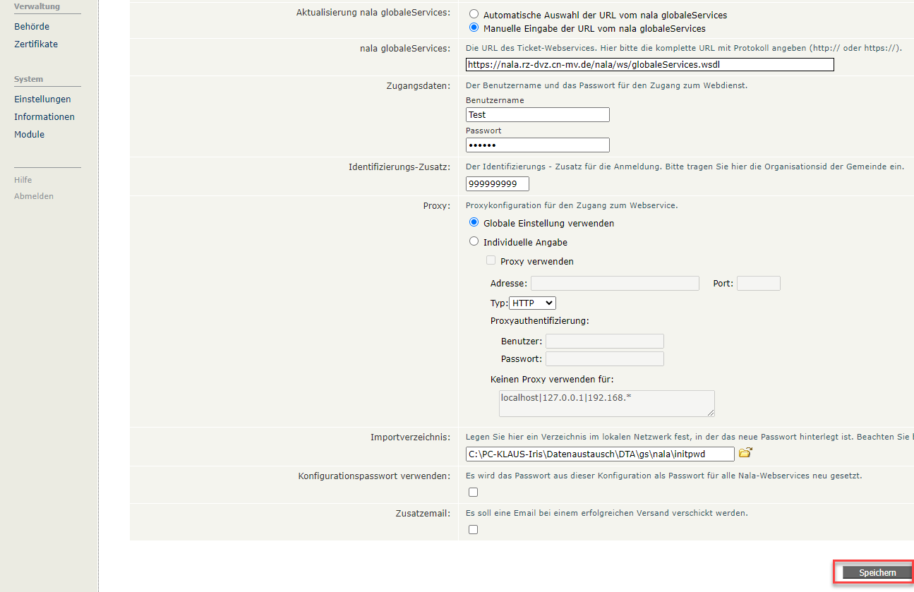 Tragen Sie nun die neue Webservice-Adresse, die Ihnen die NALA-Betreiber zukommen lassen haben in das Eingabefeld und bestätigen Sie Ihre Eingaben mit einem Klick auf die Schaltfläche [Speichern].