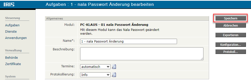 Klicken Sie nun auf die erste Aufgabe namens [1 - nala Passwort Änderung] und wählen Sie im Anschluss die Schaltfläche [Konfiguration] auf der rechten Seite.