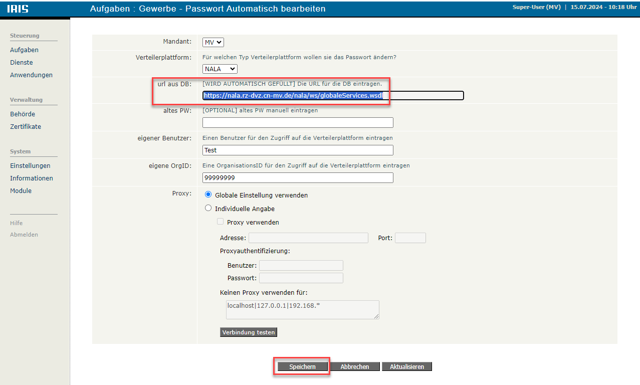 Ändern Sie nun den Radio-Button auf die Auswahl [Manuelle Eingabe der URL vom nala globaleServices].